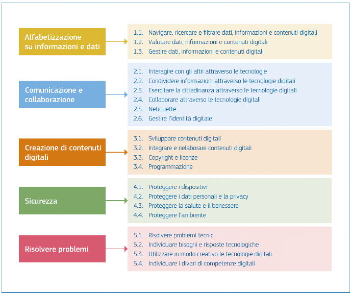 DigComp 2.2 è l’ultimo aggiornamento del quadro di riferimento europeo per le competenze digitali. Questo framework definisce le 21 competenze chiave necessarie per affrontare le sfide digitali in vari contesti, suddivise in 5 aree principali: